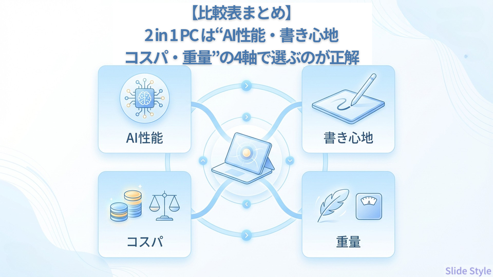【比較表まとめ】2026年の2in1 PCは“AI性能・書き心地・コスパ・重量”の4軸で選ぶのが正解