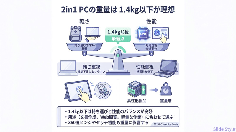 比較表を見ると分かるように、2026年の2in1 PCは AI性能(NPU)、タッチペンの描き心地、価格(コスパ)、重量 の4つで方向性が大きく分かれます。