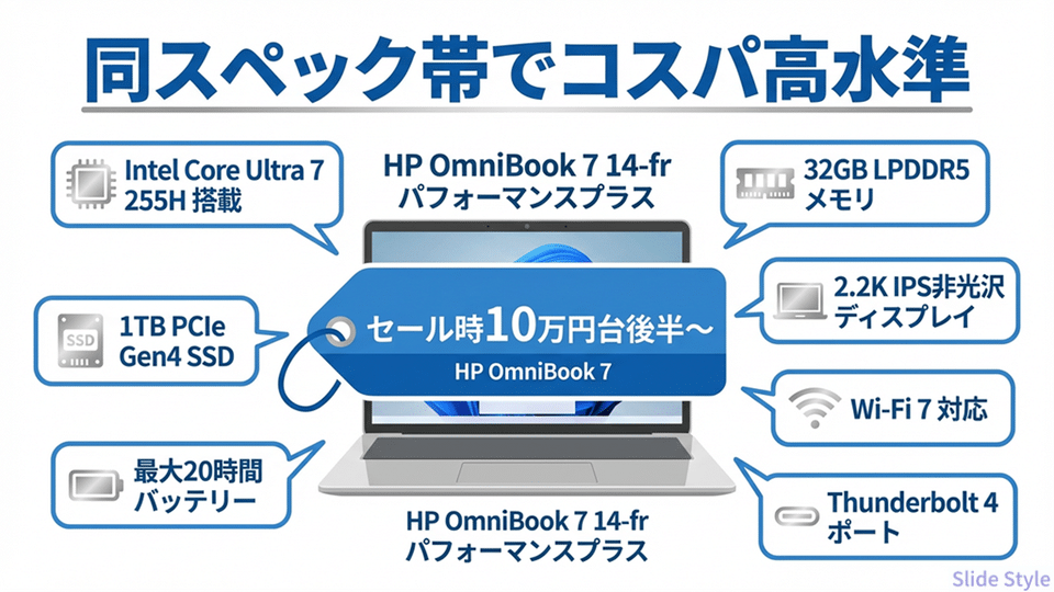 【OmniBook 7 14-fr パフォーマンスプラス レビュー】Core Ultra 7 255H搭載、14インチで圧倒的性能とバッテリー20時間の実力を検証 - 大学生・初心者・ゲーマー・女子のためのパソコンガイド