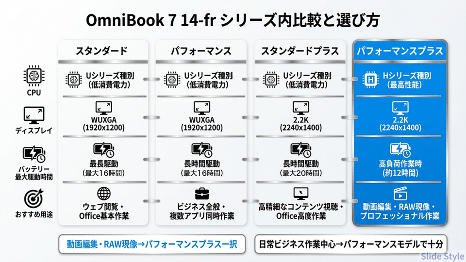 OmniBook 7 14-frシリーズは、使い方によってモデルを選べる構成になっています。