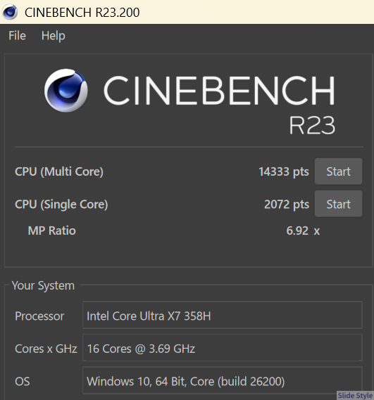 CINEBENCH R23のマルチコアスコアは14,333 pts、シングルコアは2,072 pts(当サイト実測値)。
