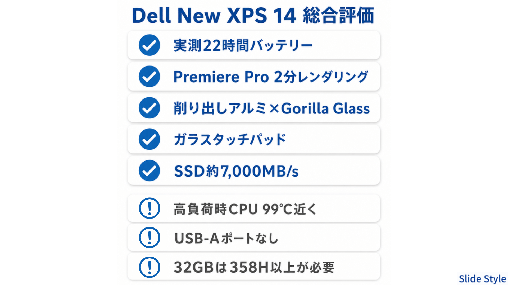 MIL-STD テスト準拠の耐久性、1年間の Dell Care Plus サポート(偶発的損傷を含む)、100% USB-C 充電という汎用性は、長期的に使う前提なら十分な付加価値です。