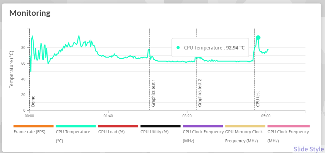 99°C近くというピーク温度は、薄型設計と電力性能のトレードオフの結果です。