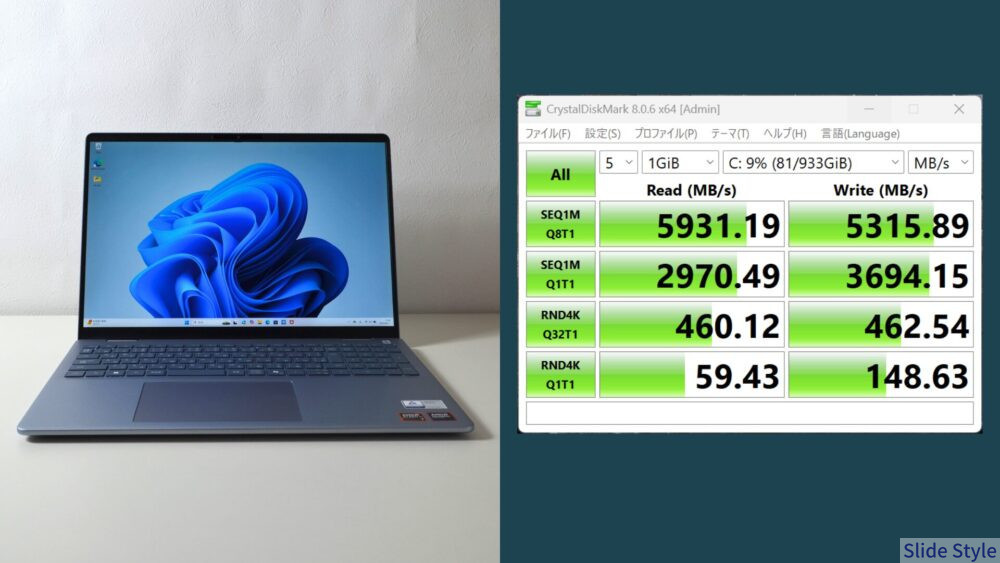CrystalDiskMarkの計測結果では読み込み約5,931MB/s、書き込み約5,315MB/sを記録しました。