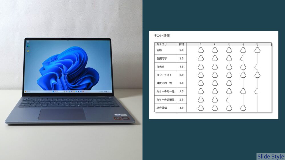 輝度均一性は3.0、色調応答は3.5とわずかなばらつきがあるものの、一般的な作業や映像制作には十分なレベルです。