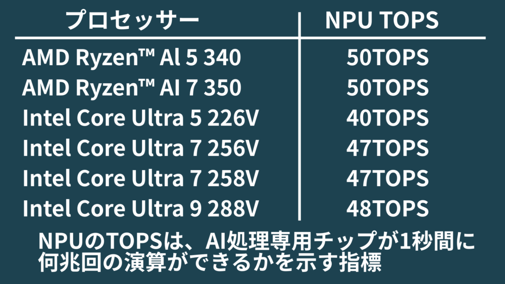 Ryzen AI 5 340およびRyzen AI 7 350のNPU性能は50 TOPS。MicrosoftがCopilot+ PCの認定条件として定める40 TOPS以上を余裕でクリアしています。
