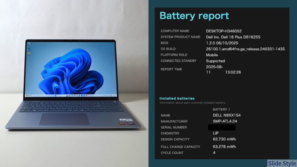 “Dell 16 Plus(AMD)”は、64Whの大容量バッテリーを搭載しています。