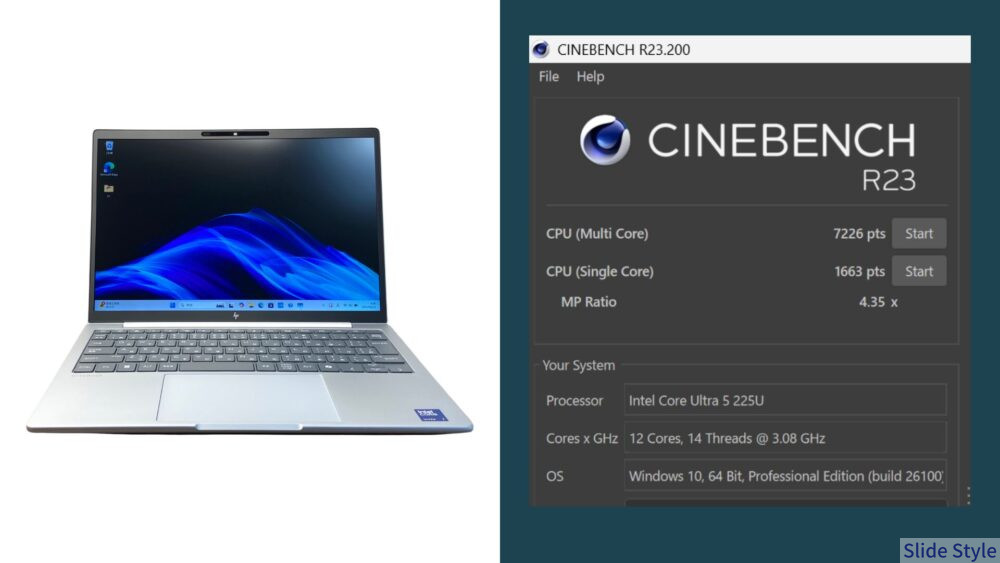 Core Ultra 5 225UのCINEBENCH R23のマルチコアスコア7226ptsは、前世代のCore i5と比較して約30%の性能向上を実現。