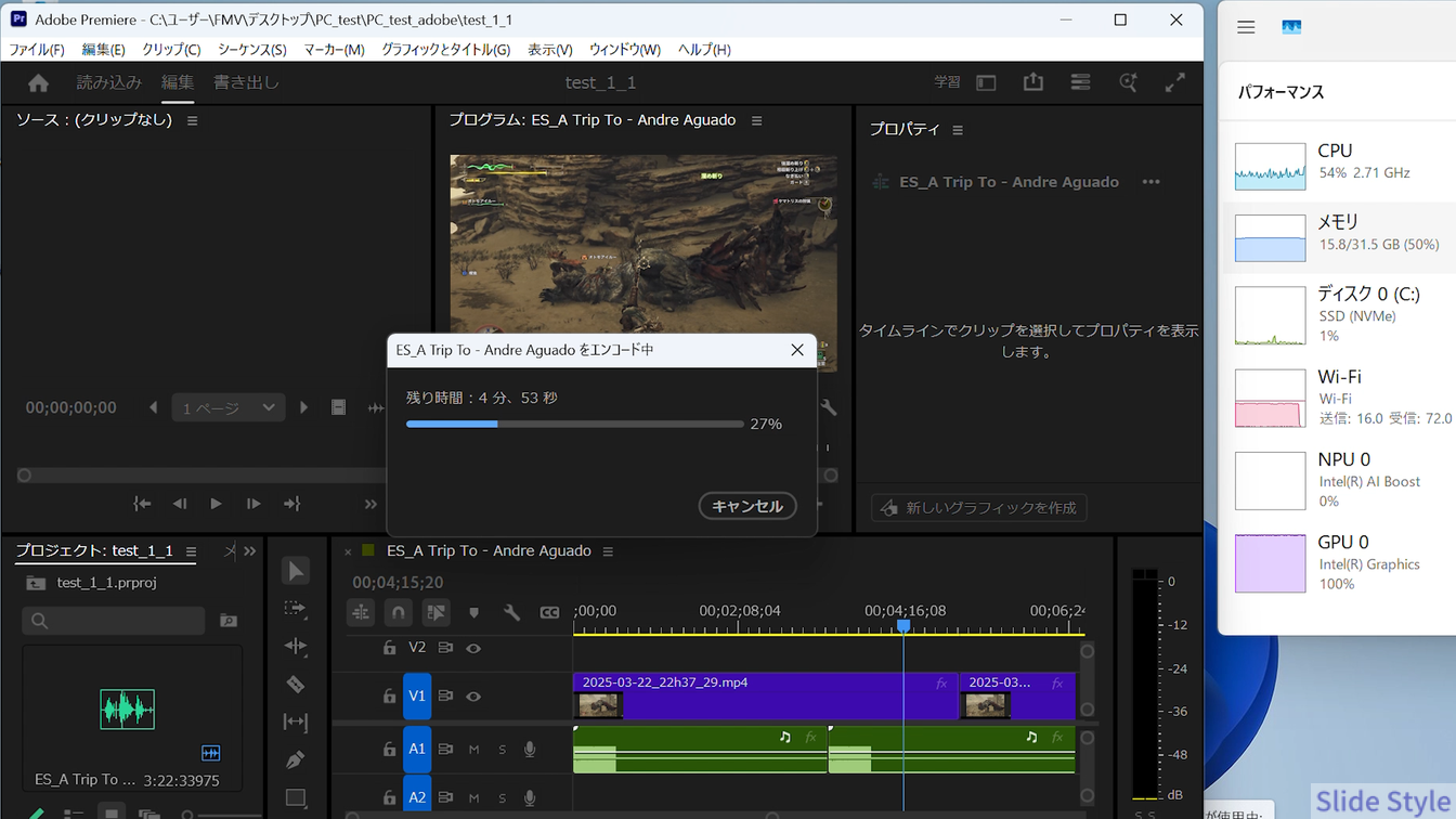 4K動画のエンコードをAdobe Premiere Proで実施し、GPU使用率が100%に達することを確認しました(当サイト実測)。出先での簡単な編集・書き出しは実用範囲です。