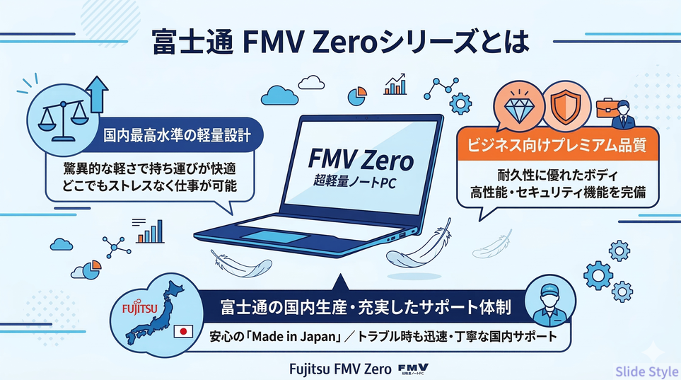 富士通のFMV Zeroシリーズは、「Zero=余計なものをすべて削ぎ落とした設計」というコンセプトのもとで開発されたモバイルノートPCラインです。法人向けPCの分野で長年の実績を持つ富士通が、コンシューマー向けにも展開しているシリーズ。