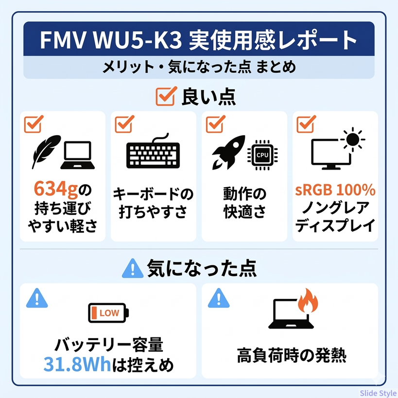 出先の作業はOffice・ブラウザ・Zoomが中心で、処理負荷の高い作業は社内デスクのPCやデスクトップで対応しているという使い方の人には、634gで済むWU5-K3が刺さります。