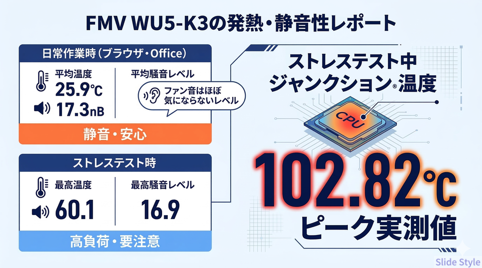 外装パームレストや底面の表面温度とは別の数値で、直接体感する熱さとはイコールではありません。