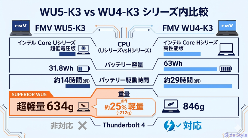 軽さ最優先ならWU5-K3(634g)です。外出先でも重い処理をこなしたい、バッテリーを長く持たせたい、Thunderbolt 4でドックや高速ストレージを接続したいなら、212g重くなりますがWU4-K3の方が合います。