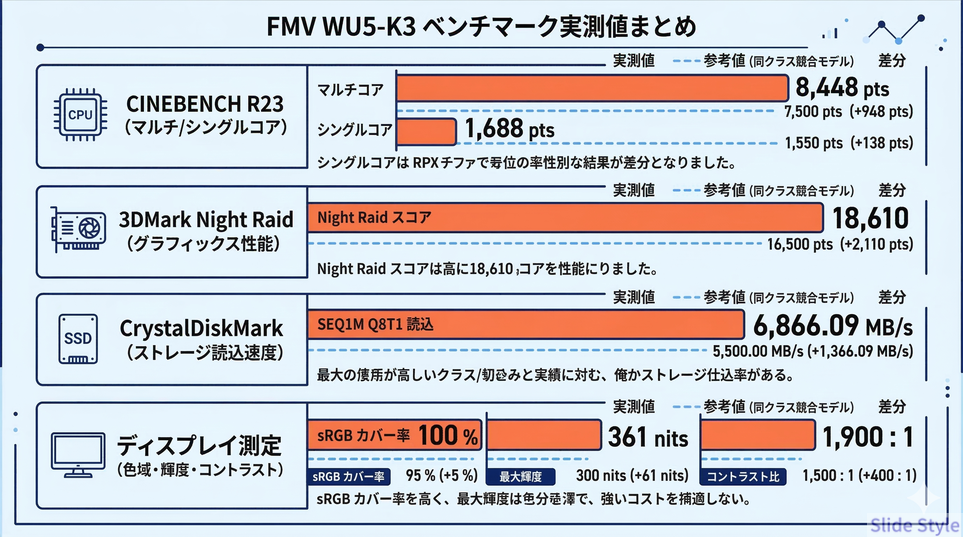 このレビューでは、実測SSD速度(Read 6,866.09 MB/s)やディスプレイ品質(sRGB 100%・1900:1コントラスト)の検証結果、上位機種WU4-K3との違い、そしてメモリがオンボードで増設できないという重要な注意点まで、購入前に知っておくべきことを正直にまとめました。