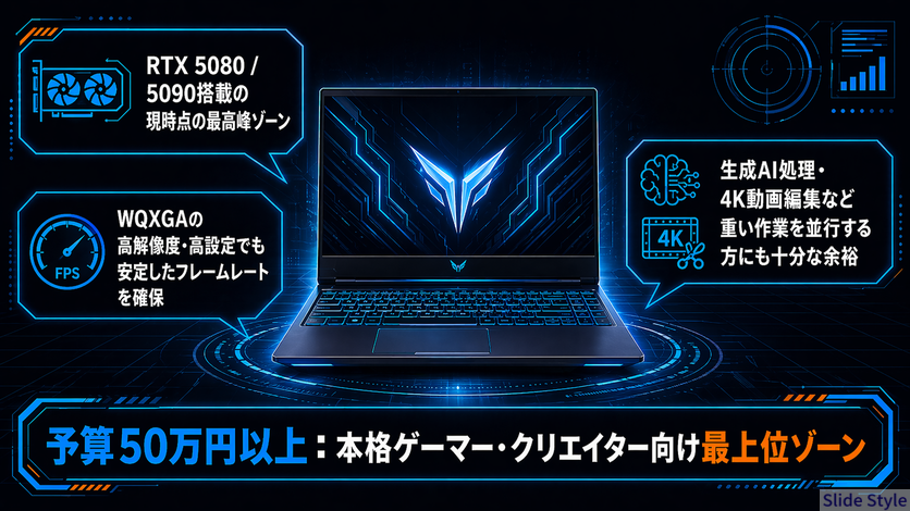 - 50万円以上で最高の環境を:OMEN MAX 16 AMD(RTX 5080・約68.5万円)または ROG Strix SCAR 16(RTX 5090・約73.9万円)