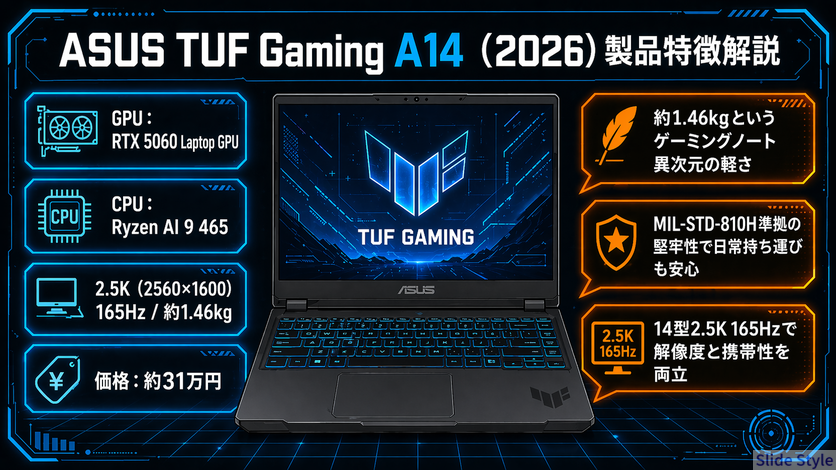 | 35〜50万円帯 | ASUS TUF Gaming A14(2026) | 約1.46kgで驚異の超軽量設計 |