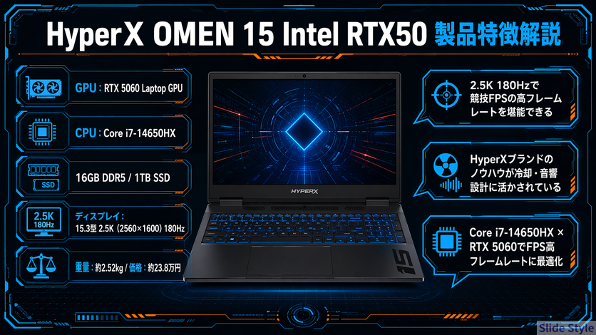 | 22〜35万円帯 | HyperX OMEN 15 | Core i7-14650HX × RTX 5060で配信余裕 |