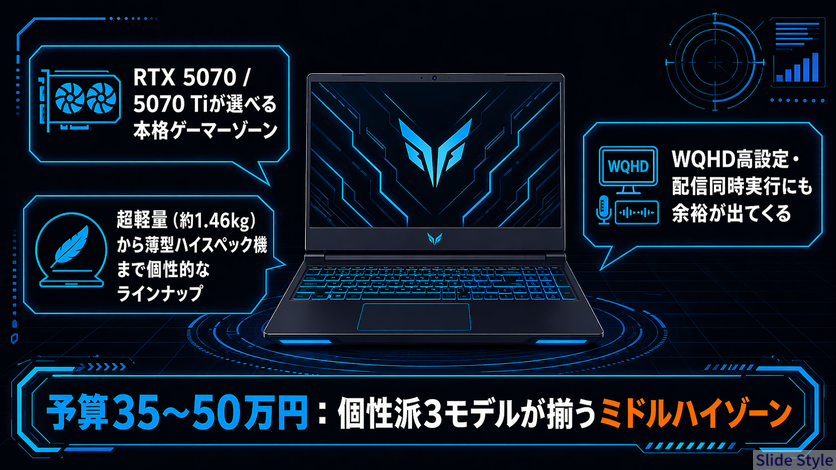 | 35〜50万円帯 | ROG Zephyrus G16 | 約1.9kgでRTX 5070 Ti搭載 |