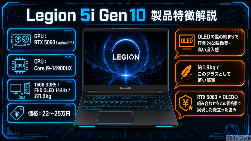 Legion 5i Gen 10 | RTX 5060/ Core i9-14900HX/ 約1.9kg | 約22〜25万円 | RPG・バランス重視 | 公式サイトで見る レビューを読む |