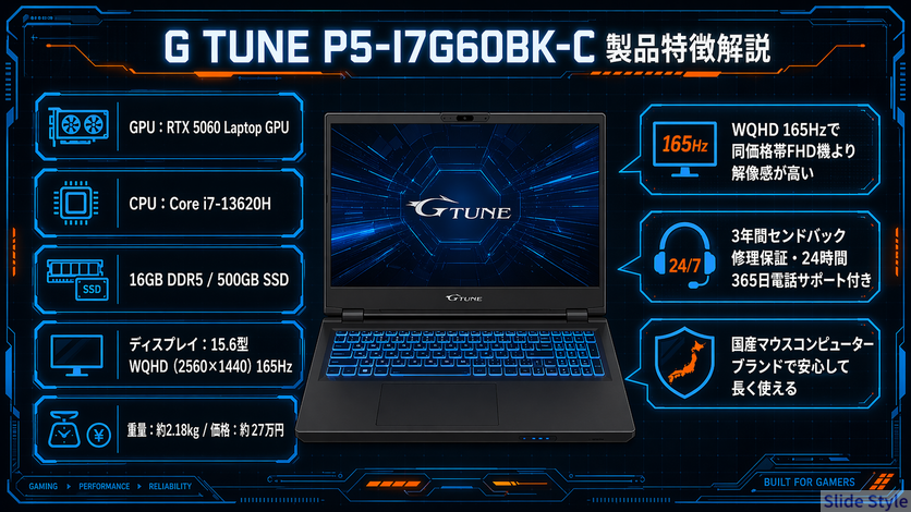 G TUNE P5-I7G60BK-C | RTX 5060/ Core i7-13620H/ 約2.18kg | 約27万円 | 国産・WQHD高画質・3年保証 | 公式サイトで見る |