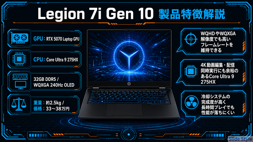 Legion 7i Gen 10 | RTX 5070/ Core Ultra 9 275HX/ 約2.5kg | 約33〜38万円 | 高負荷ゲーム全般・ 配信 | 公式サイトで見る レビューを読む |