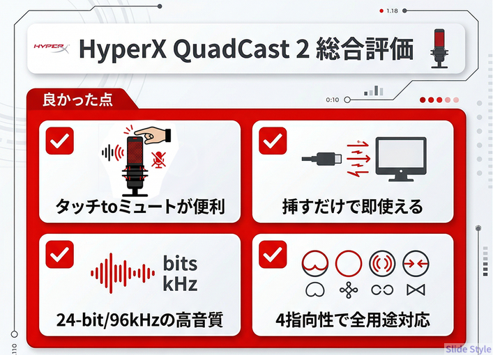 HyperX QuadCast 2は、ゲームも配信も会議も、1本でまとめたい人におすすめのマイクです。
