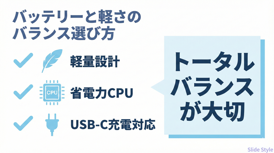 文系女子大学生のノートパソコン選びでは、バッテリー持ちの良さも非常に重要なポイントです。