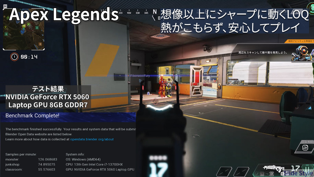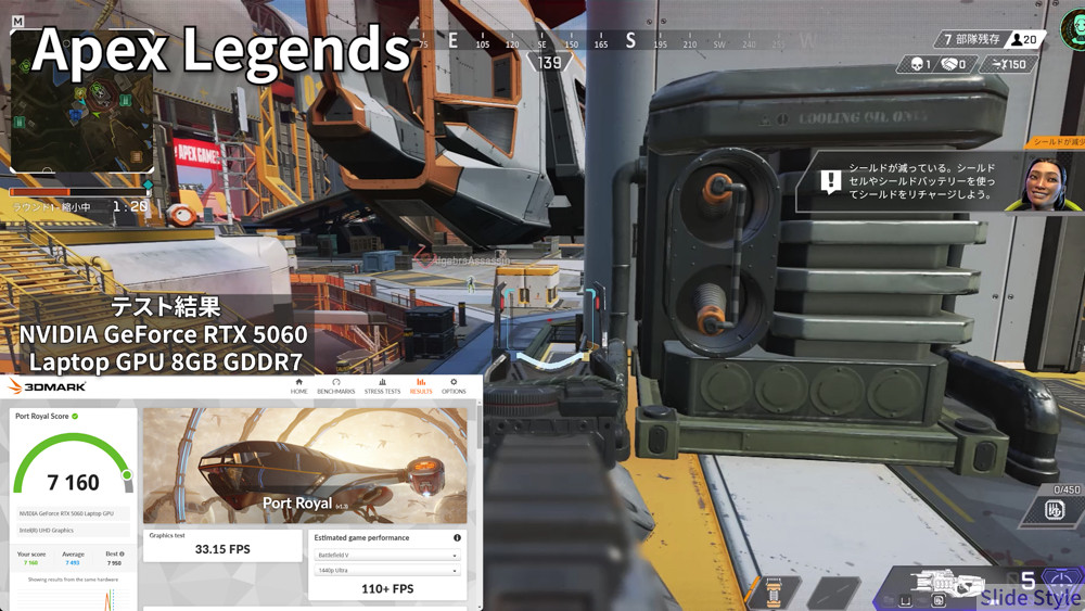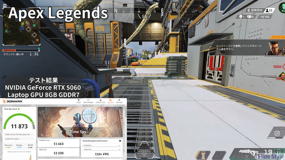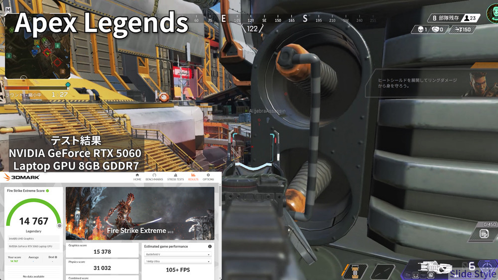 Apex Legendsのプレイ画面にテスト結果を表示しています。