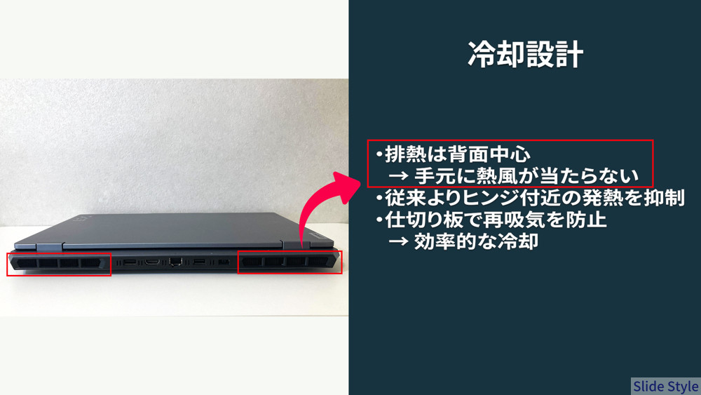 熱をヒンジ部分から背面へと逃がす構造で、手元の温度上昇を抑えています。