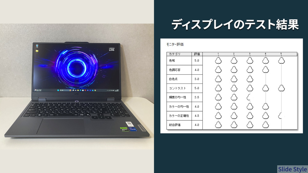 モニター評価では、色域5.0/コントラスト5.0/色精度4.5/総合評価4.0と高いスコアを記録。