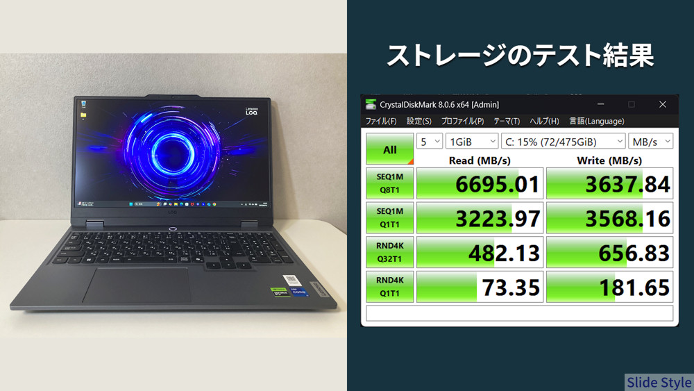 PCIe Gen4 NVMe SSD(512GB/1TB)は、CrystalDiskMarkで読み込み6,695MB/s/書き込み3,637MB/s。