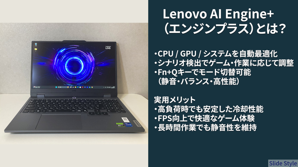 “LOQ 15IRX10”では、Lenovo独自のAI Engine+がリアルタイムで温度と負荷を監視し、CPU・GPU・ファンの動作を自動で最適化します。