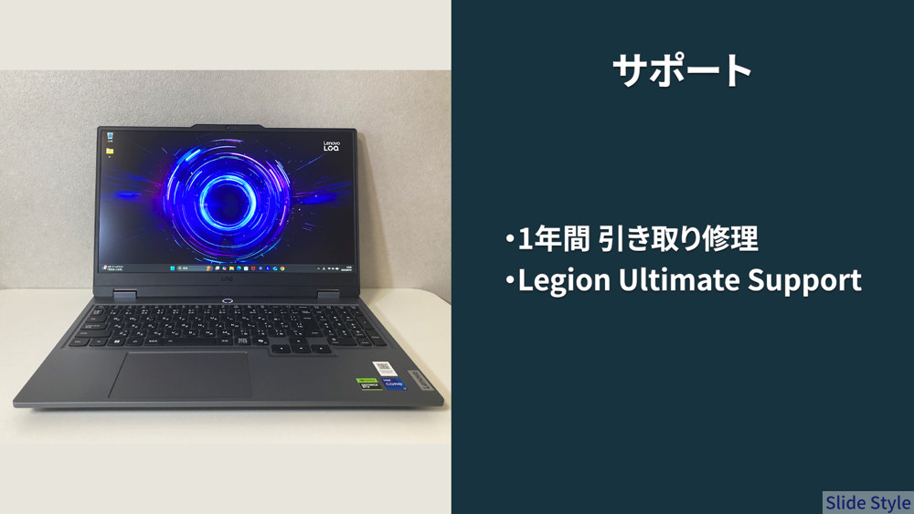 “LOQ 15IRX10”には、1年間の引き取り修理保証が標準で付属しています。