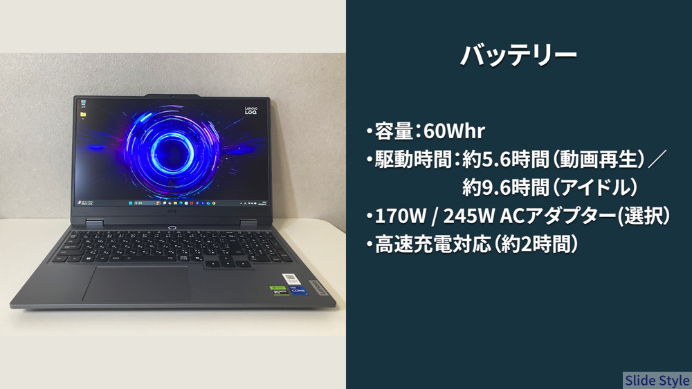 60Whバッテリーを搭載し、動画再生で約5.6時間、アイドル時は最大9.6時間駆動。