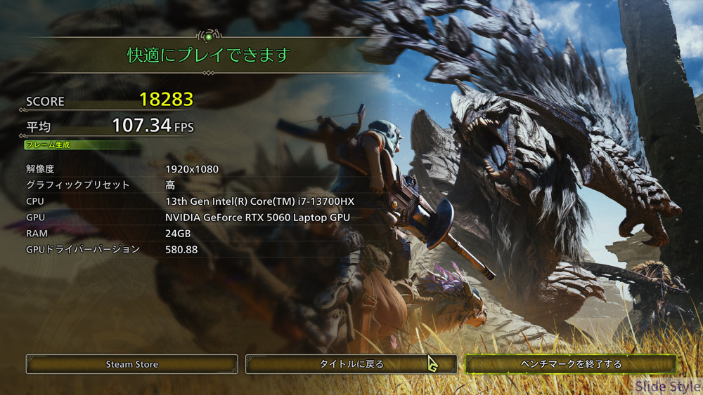 モンスターハンター ワイルズのベンチマークでは、平均107fpsを記録。