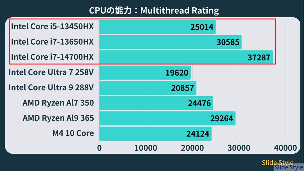 上のグラフは、今シーズンの一般的なビジネスノートに搭載されているCPUとのベンチマーク比較です。