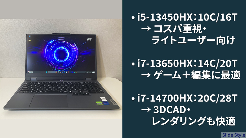 “LOQ 15IRX10”では、CPUをCore i5-13450HX/Core i7-13650HX/Core i7-14700HXの3種類から選択できます。