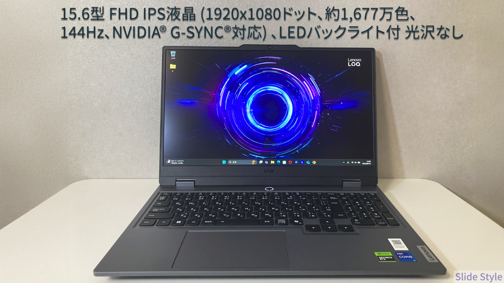 15.6インチのフルHD IPSパネル(1920×1080)は、sRGBカバー率100%・リフレッシュレート144Hzに対応。