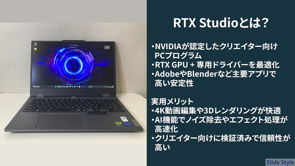 また、RTX 50シリーズはNVIDIA Studioドライバーにも対応し、