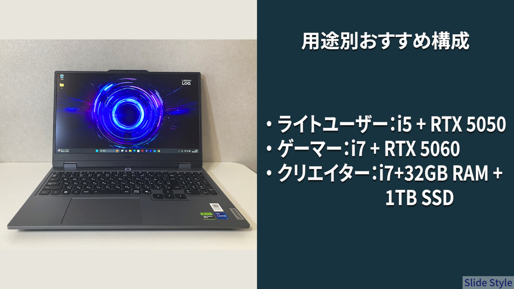 • コスパ重視:Core i5+RTX 5050(学生・初心者向け)