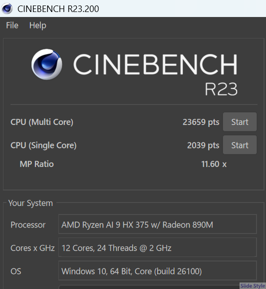 - CINEBENCH R23 マルチ23,659ptsの高いCPU性能