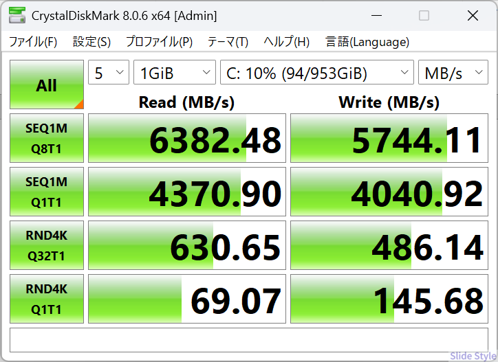 当サイトの実測(CrystalDiskMark)では、シーケンシャルリード 6,382 MB/s、ライト 5,744 MB/s を記録しました(後述のベンチマーク参照)。
