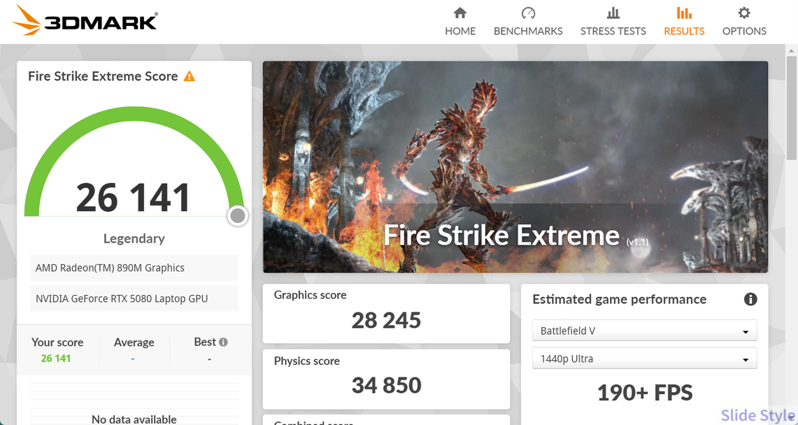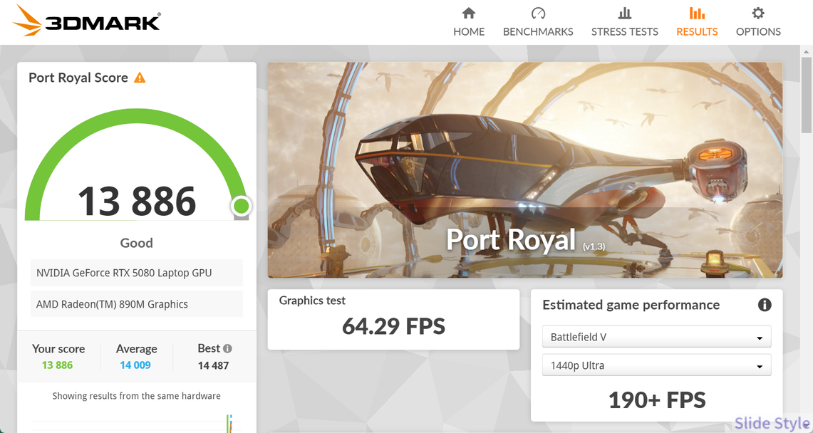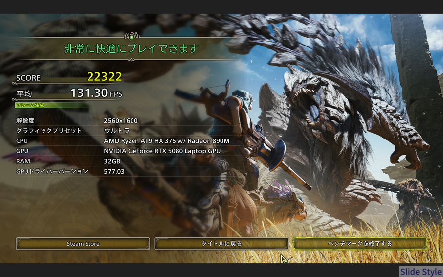 性能面では、RTX 5080 Laptop GPUによる最新ゲームへの対応力は十分高く、DLSS 4のマルチフレーム生成も活用できます。