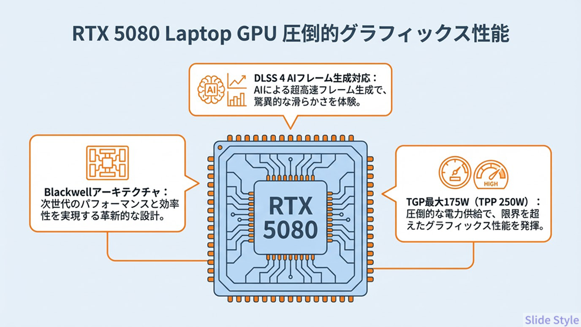 搭載されているRTX 5080 Laptop GPUは、NVIDIAの最新Blackwellアーキテクチャを採用。