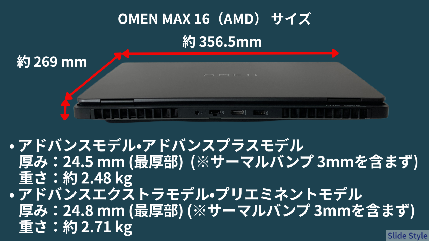 本体サイズは約356.5 × 269 × 24.8 mm、重量は約2.71 kg。