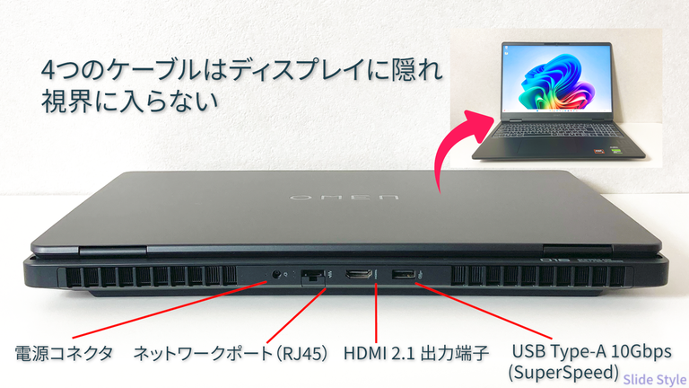 天面のOMENロゴはシンプルで控えめ。
