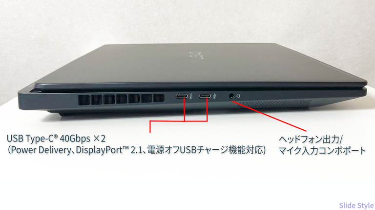 マットブラックの質感は高級感があり、ゲーミングPCによくある過剰な装飾がなく、オフィスや外出先でもなじむデザインです。