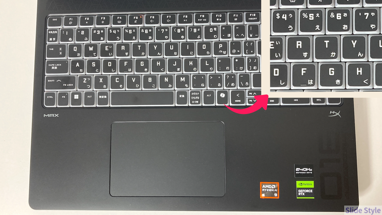 Per-RGBバックライト搭載の日本語キーボードを採用。