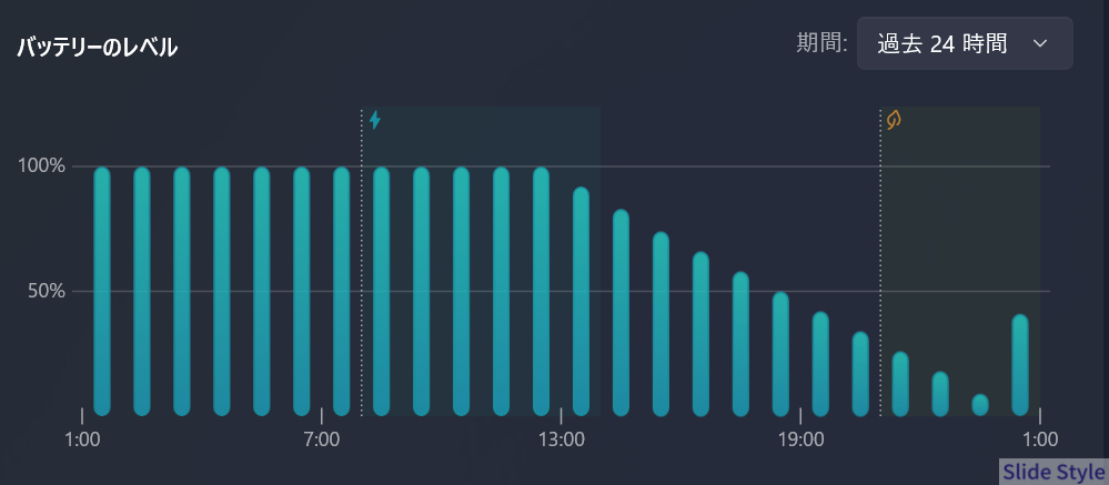 実際の計測では、省電力モードで層が再生時間は約12時間でした。