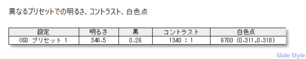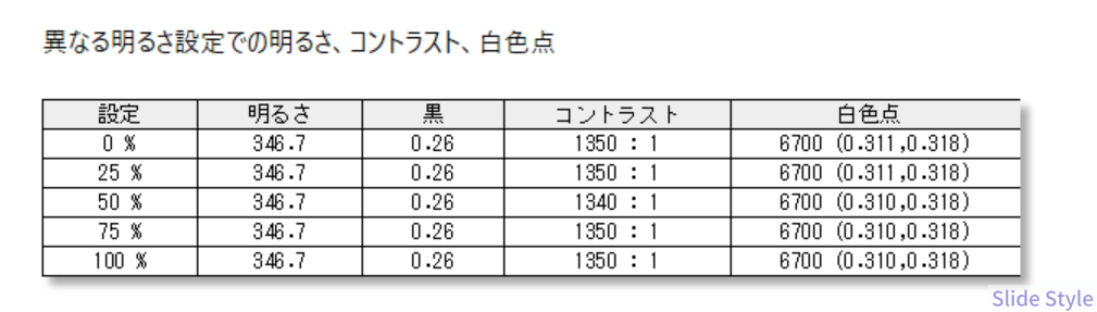 SpyderProで測定したデータでは、輝度346.7 cd/m²、コントラスト比1,350:1。